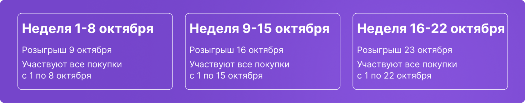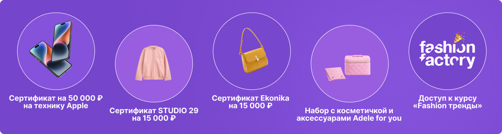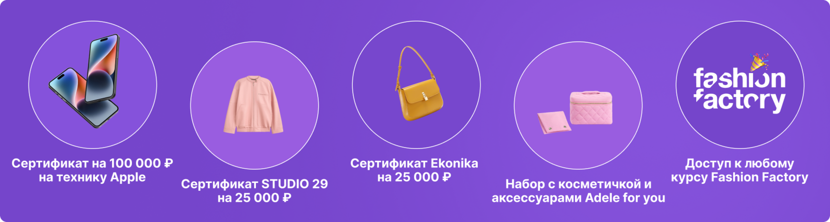 Празднуем юбилей весь октябрь и дарим подарки за покупку любого курса! | | | | Проводим розыгрыш призов каждую неделю | | | | Каждый понедельник случайным образом выбираем 5 победителей среди купивших курсы с начала октября. Каждую неделю можно выиграть: | | | | Чем раньше покупка — тем больше призов | | | | Если вы купили курс на первой неделе октября, то участвуете в розыгрыше 3 раза. Если на второй неделе — 2 раза. Чем раньше покупка — тем больше призов! | | | | Все, кто купил курс с 1-31 октября, участвуют в главном розыгрыше. Даже если вы уже выиграли приз в недельной лотерее, вы также участвуете в МЕГА розыгрыше. | | | | Гарантированный подарок при покупке любого курса* | | | | *Кроме курса «Fashion тренды: история, анализ и будущее» | | | |