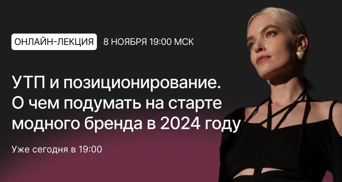 | Уже сегодня — онлайн-лекция «УТП и позиционирование. О чем подумать на старте модного бренда в 2024 году». Встречаемся в 19:00 по МСК. | | | Вместе с Юлией Кудрявцевой обсудим:- что такое УТП и как оно отличается в России, США и Европе
