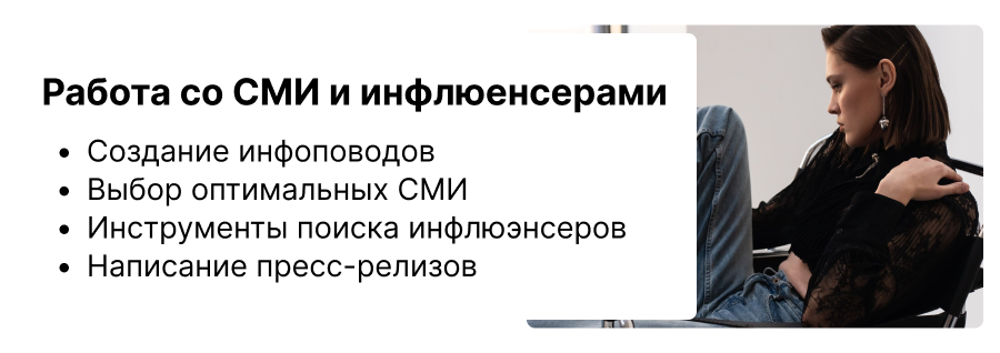 19 лет работает в журналистике и PR, из них последние 15 лет — в области Fashion PR. Начинала как журналист в деловых изданиях (РБК и «Коммерсантъ»), затем сформировала и возглавила PR-отдел дома Louis Vuitton в России. | | | | На онлайн курсе студентов ждут 2 практических задания. Разработка PR стратегии — вы самостоятельно построите стратегию продвижения для модного бренда и определите каналы взаимодействия с аудиторией. Пресс-релиз для СМИ — вы напишете пресс-релиз для модного СМИ и получите его разбор от лектора курса. | | | | Другие курсы Fashion Factory | | | | | Fashion Impulse Pro | | Создайте свой модный бренд за 4 месяца. Очные занятия, встречи с основателями брендов, коллаборации и контакты. | | | | | | Продакт-менеджер в fashion | | Научитесь создавать коммерчески успешные коллекции одежды и аксессуаров. Курс при участии экспертов 12 STOREEZ. | | | | | | Профессия Стилист | | Сделайте увлечение профессией, приносящей доход. Специальный спикер предстоящего потока: Алексей Сухарев. | | | | | | |