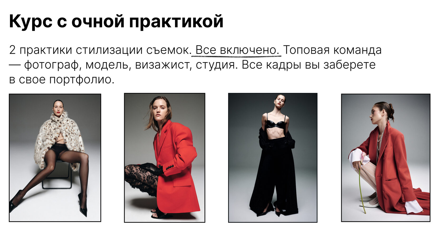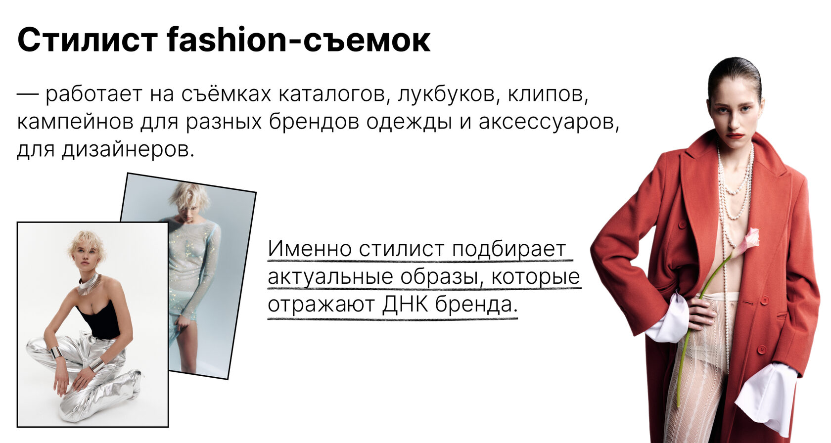 | Научим стилизовать fashion-съемки как профи | | | | Стилизация съемок — одно из самых востребованных направлений в модной индустрии. Если вы хотите работать в творческой атмосфере, постоянно следить за трендами, общаться с креативными людьми, работать с fashion-брендами и журналами — эта профессия для вас. | | | | Обучают стилисты практики: | | | | | Анна Сенина | | Head of styling в бренде Lime. Ex-стилист и редактор моды журналов Glamour, Tatler, Vogue. Ex-cтарший редактор моды журнал L’Officiel, директор моды журнал Л’Этуаль. | | | | | | Пётр Поляков | | Профессиональный фотограф, работает с лучшими российскими брендами — Sashaverse, Agreeg, Lesyanebo, Present & Simple, Naked Shoulders и др. | | | | | | Даша Glamorama Людная | | Эксперт по цвету и контенту. Работала с такими брендами как ELKA, Marchelas, Chaika store, Volchek bags, Московский универмаг, Тверская4, Ligio, free age и Катей Йова на съемках видеокликлипов.
