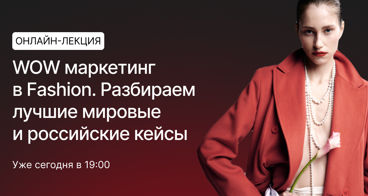 | Уже сегодня — онлайн-лекция «WOW-маркетинг в fashion: лучшие российские и мировые кейсы». Встречаемся в 19:00 по МСК. | | | | Вместе с Александрой Лариной разберем: | | | - В чем отличие маркетинга от WOW-маркетинга
